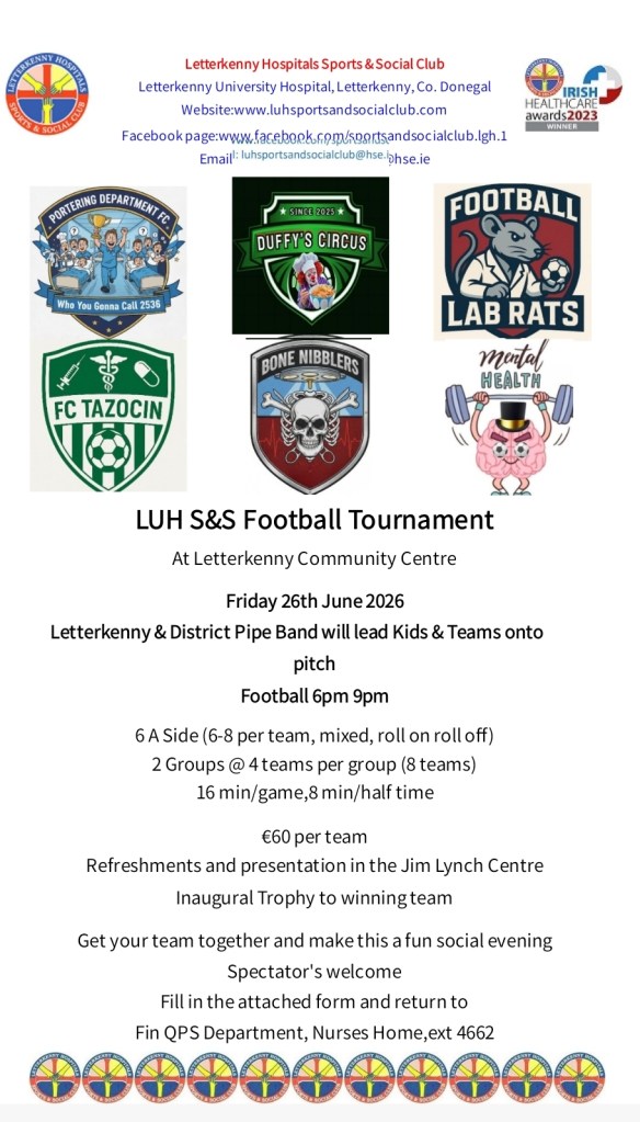 Please find poster attached for our Letterkenny Hospitals Sports and Social Club Football Tournament 2026. It’s time to Start gathering your teams & practising your crossovers for another great competitive evening at the Letterkenny Community Centre on Friday 26th June 2026.