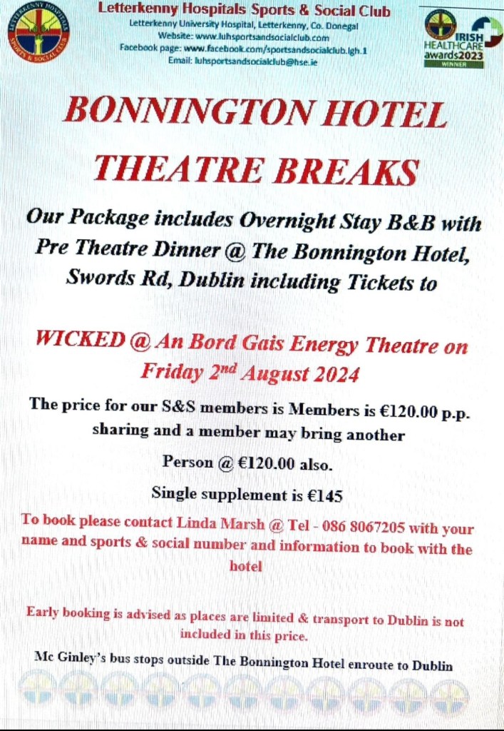 We have another wonderful deal with Bonnington Dublin Hotel to see Wicked, An Board Gais Theatre, Dublin. To include Pre Theatre Dinner, B&B & bus to Theatre & tickets for the show. Please see poster attached for further information & booking details.
