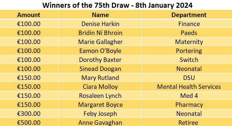 Congratulations to all of the winners of our first draw of the new year in January 2024. Just to let everyone know that the winners may contact Bernie McGinty at ext – 3508 or bernie.mcginty@hse.ie to collect their cheque.