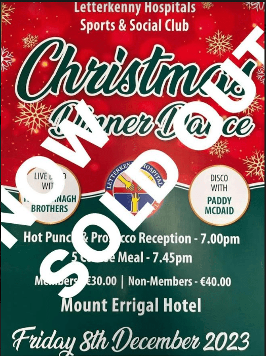 The planning has started for 2024!! Just to let you all know to keep Friday 6th December free for next years LUH Sports & Social Club Dinner Dance 2024. Also Sunday 8th December for our Children’s Christmas Party at the Mount Errigal Hotel, Letterkenny, Co Donegal.