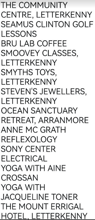 We would like to take this opportunity to thank all of the business listed for their very kind donations to our 2023 LUH Sports & Social Club Christmas Draw & Dinner Dance. We appreciate all of the Vouchers & Gifts that were very kindly donated to us for our draws that were held last week. We would kindly ask our members to shop local and support these businesses who have been very kind to us this year & always remember to use your LUH S&S Card while shopping this Christmas. Thank you so very much for your Kindness.