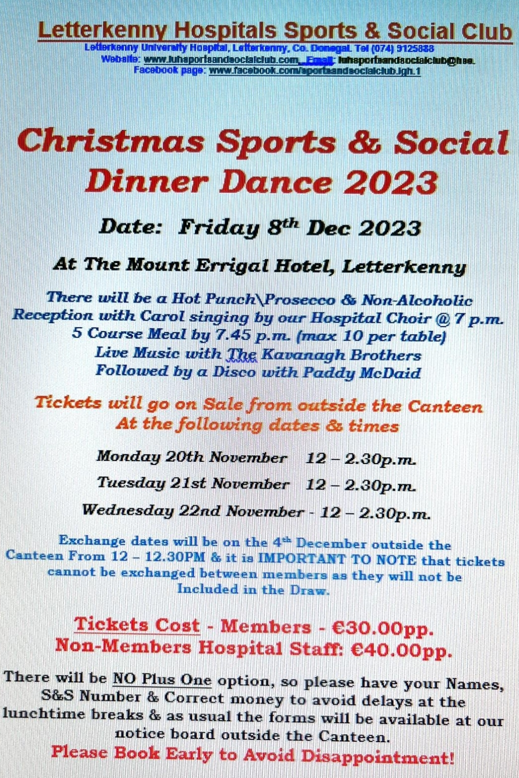 It’s the information you have all been waiting for !!! Please find details for The Sports & Social Christmas Dinner Dance 2023. Our Dinner Dance will be on Friday 8th December from 7pm. The Mount Errigal Hotel, Letterkenny are offering a discount price for our members to avail of on the night of the Christmas Dance, please see poster for further information & booking details. Forms have been left at our Notice Board also to collect names for departments wishing to purchase tickets for the dance. We would ask you all to kindly fill these forms out with your name, S&S membership number & department. There will be a maximum of 10 persons per table. Dates for the ticket sales are also on the poster.