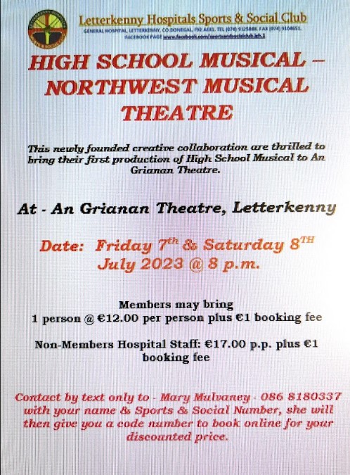 We have a show in An Grianan Theatre The High School Musical on Friday 7th & Saturday 8th July 2023. See poster for all of the information required for booking. Book early to avoid disappointment.