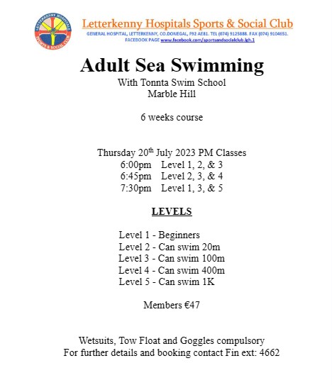 We have Adult Sea Swimming for our members commencing on Thursday 20th July. There is a big demand on these classes so need to register early if interested. See poster for further information and details on how to book same.