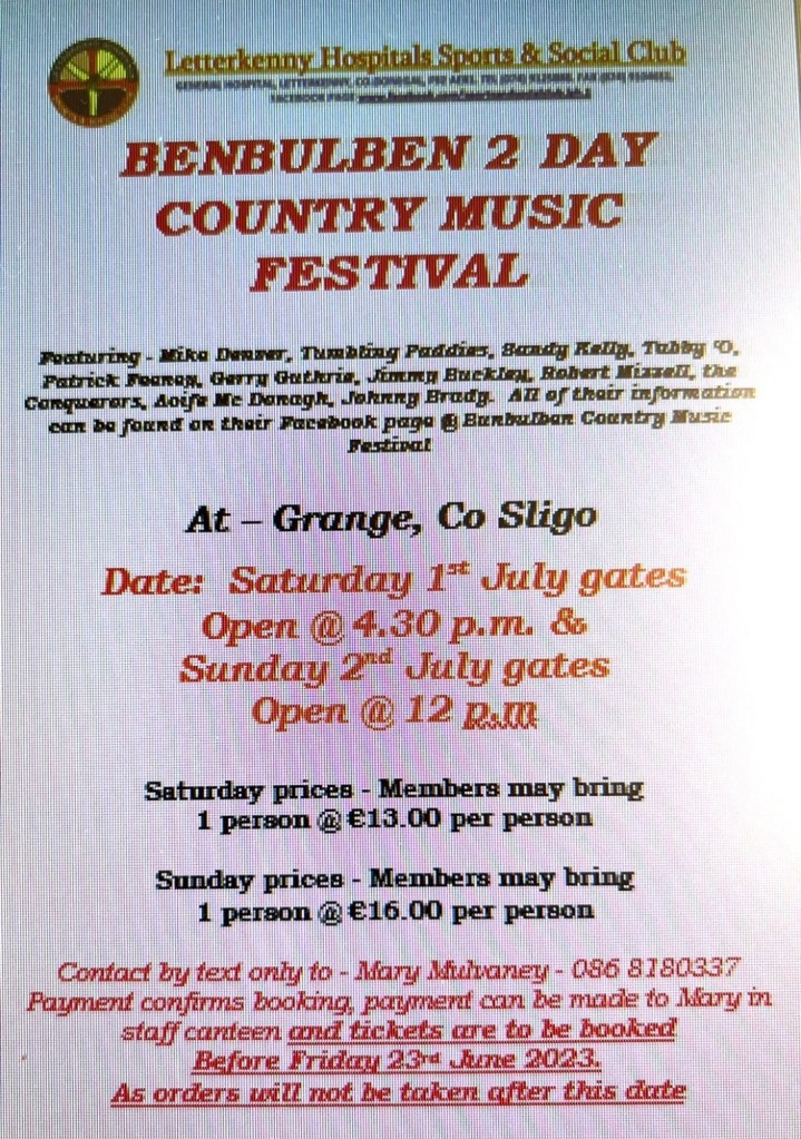 We are offering tickets at reduced prices for our members for SULT Goath Dobhair on Friday 7th – Sat 8th July 2023. Cost on Friday 7th July – Members €30.00 per person & you may bring a plus one for €30.00 also. Cost for Fri & Sat – members €54 per person & you may bring a plus one at €54 also. Prices for camping & events are also set our in the picture also. Please see poster attached for further information & booking details. Tickets can only be purchased before Wednesday 5th July 2023. See their website also for further details @ https://sultfeile.ie & @ Sult Feile Gweedore.