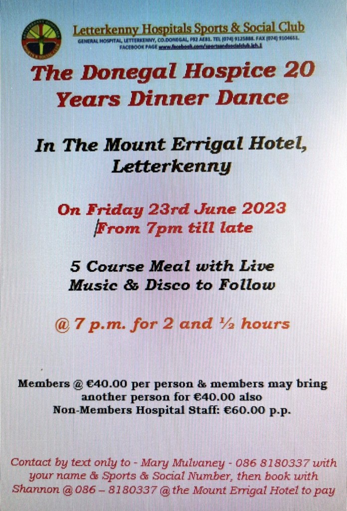 Reminder for anyone wanting to attend The Donegal Hospice Dinner Dance who are hosting their 20th Year Dinner Dance with a 5 course Dinner Dance. We have tickets at a reduced price available for our S&S club members. See poster for further information and details.