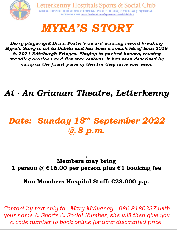 Please see information attached for the Oakfield Park, Raphoe, Co Donegal. Contact Tracy at the number provided quoting your membership number and she will provide you with a code to book your tickets online, tickets are costing €20 for adults + €1.53 booking fee & €10.00 for children + 93 cents booking fee. Please book early to avoid disappointment.