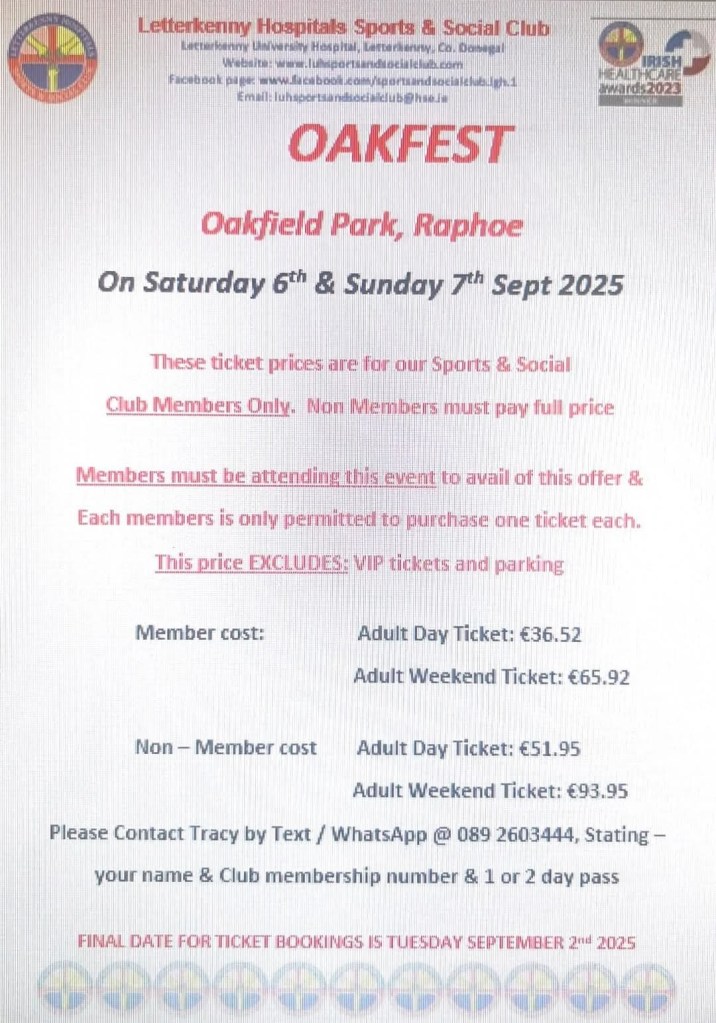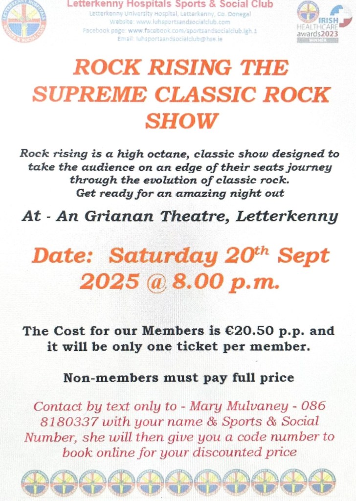 We still have some tickets available for Rock Rosing – The Supreme Classic Show. Rock Rising is a high octane, classic rock show designed to take an audience on an edge of their seats journey through the evolution of classic rock. Showcasing an excellent 7-piece band, taking incredible musicianship and stagecraft to a different level, this show features rock anthems from legendary acts such as Fleetwood Mac, The Eagles, Pink Floyd, AC/DC, journey, Toto, Thin Lizzy and many more multi-platinum selling artists from the lasty four decades. Please see poster attached for further information & booking details. The cost for our members is €18.00 & only one ticket may be purchased per member. Non members must pay full price….An Grianan Theatre.