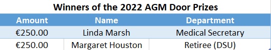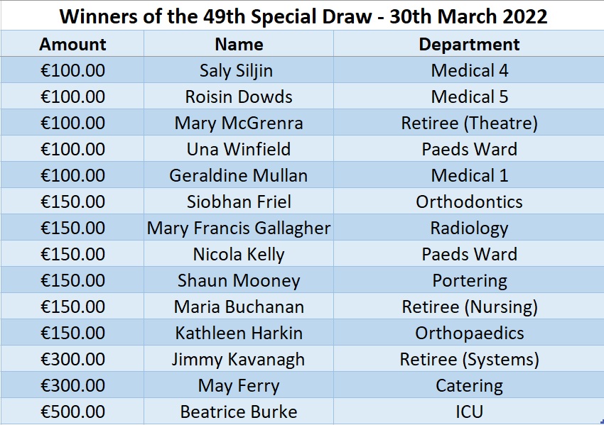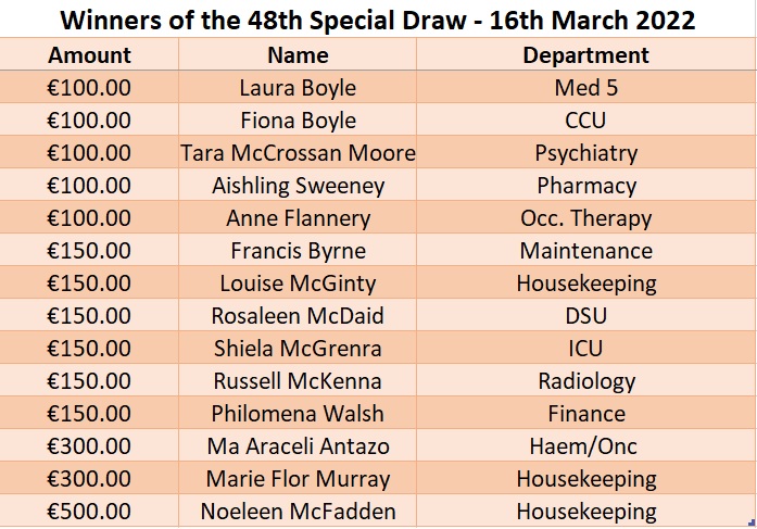 Congratulations to all of the winners of this weeks draw Just to let everyone know that the winners are not to collect the cheques, but to contact Fin Begley either by email or by phone and let her know where to post the cheques to. Her contact details are – Fin.Begley@hse.ie or Ext: 3735 Our next Draw will be held on 02nd March.