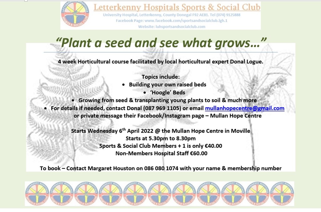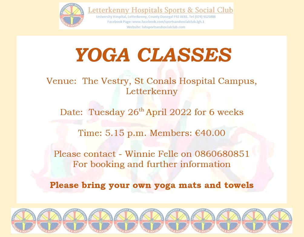 Yoga classes for all levels starting at 5.15pm on Tuesday 8th March 2022 for 5 weeks. Price is €35 each per member for 5 week course. The classes will be held in The Vestry, St Conal’s Hospital, Letterkenny. To book or for further details Please contact Winnie @ Tel – 086 068 0851