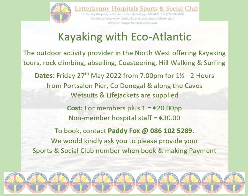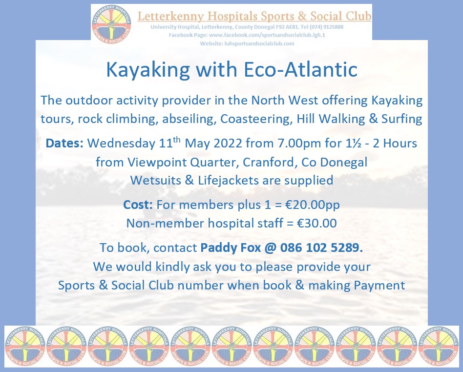 Recommended Gear 1. Mobile phone 2. Bottle of water 3. Suitable footwear 4. Walking trousers / waterproof trousers 5. Waterproof & windproof jacket. 6. Hat/scarf/gloves if required 7. Sunscreen if needed 8. Good idea to have a change of clothes for after. Any questions contact Margaret Houston 0860801074