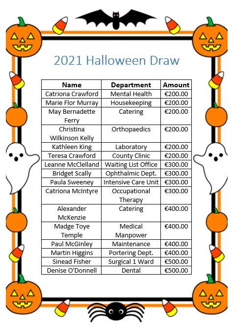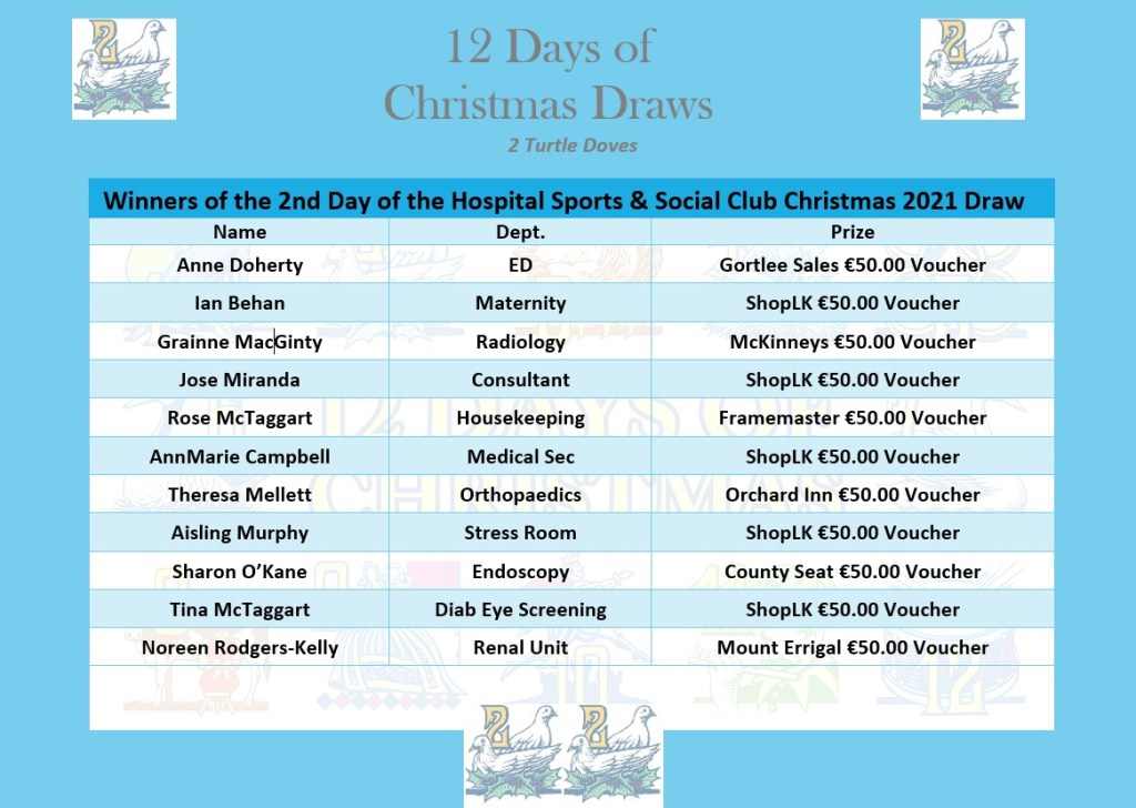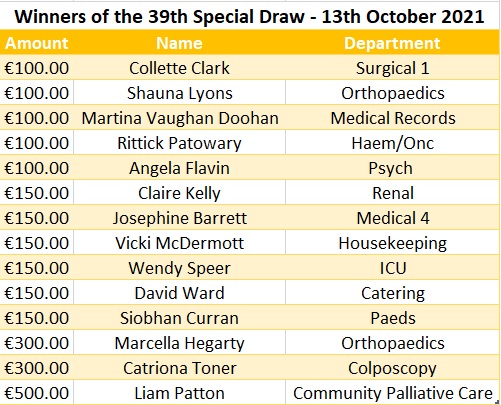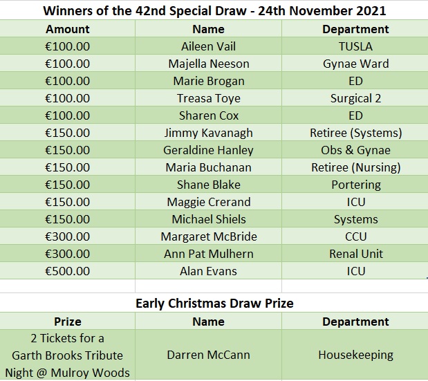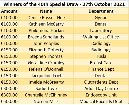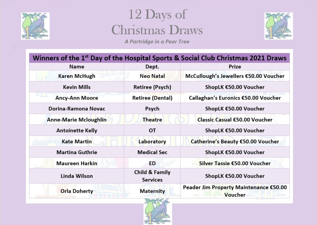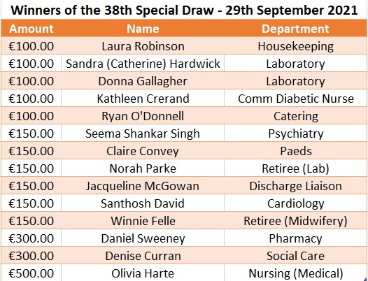 Today’s prizes can be collected from – Angela McGinley Ext. 4458, or on her mobile 087 932 2633.