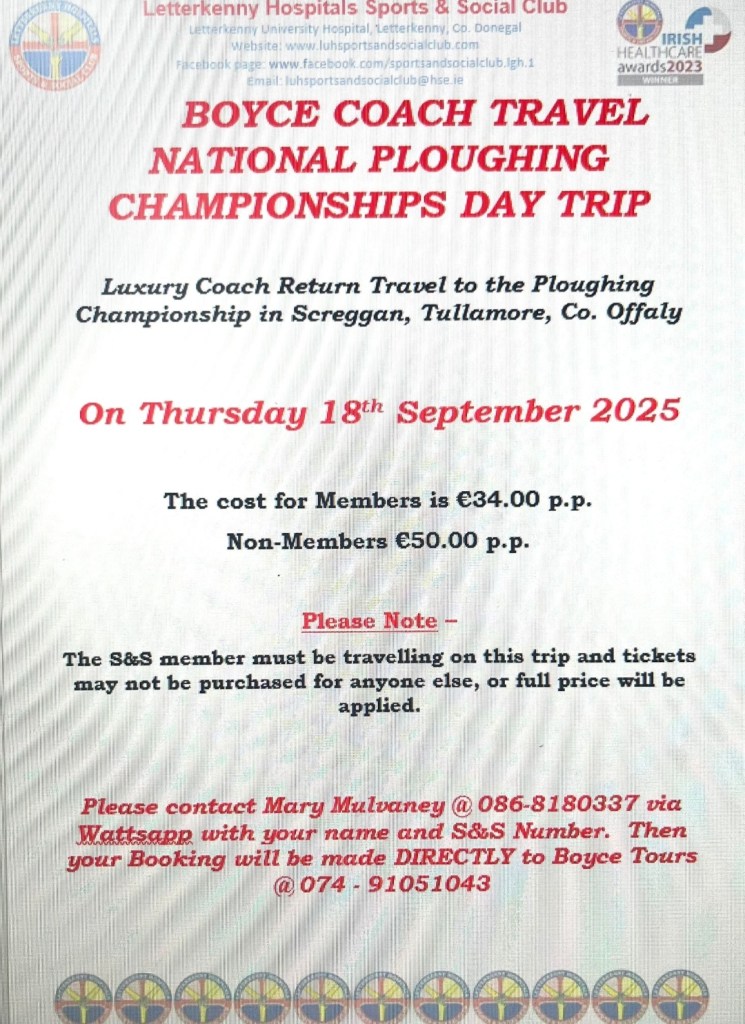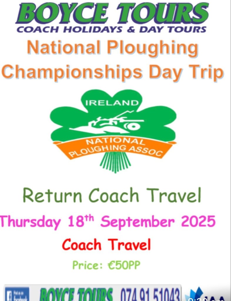 We have tickets available for a day trip with Boyce Tours to the National Ploughing Championships in Tullamore, Co. Offaly on Thursday 18th Sept 2025. Please see poster attached with further information & booking details.