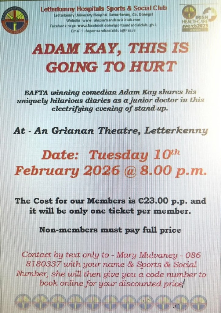 We have tickets available for BAFTA – winning comedian Adam Kay. An Grianan Theatre on 10th February 2026, where he shares his uniquely hilarious diaries as a junior doctor in this “electrifying” (Guardian) evening of stand-up. Over 350,000 tickets sold. Based on the multi-million selling book and multi-award-winning TV series. “Intersperses horror stories from the NHS frontline with a catalogue of sublimely silly spoof songs, and some blissfully brilliant wordplay” ***** Mail on Sunday. This price is for our Letterkenny Hospitals Sports and Social Club members only and it will only by one ticket per member. Non-members must pay full price.