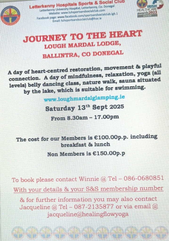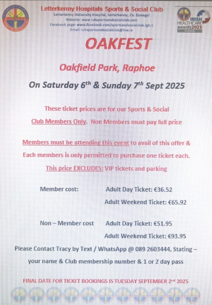 We have tickets available for our members for this years Oakfest at Oakfield Park, Raphoe for Sat 6th & Sun 7th Sep 2025. Please take note that these tickets are available for our Letterkenny Hospitals Sports and Social Club members only. Members who purchase tickets must be attending this event and not buying tickets for other people & one ticket per member only is allowed. Please see poster attached for further information & booking details. All enquires & bookings must be made directly to Tracy at the number supplied on the poster. We would advise you to book early with her to avoid disappointment.