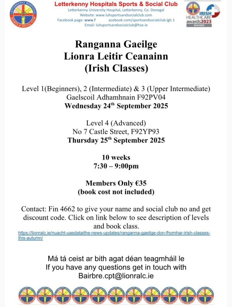 We have Irish Classes for Levels 1-3 starting on Wednesday 24th Sept in Gaelscoil Adhamhnain & Level 4 Advanced on Thursday 25th Sept @ No 7 Castle St, Letterkenny. These classes are for members only and the cost of the book is not included. If you are interested please see poster attached for further information and booking details.