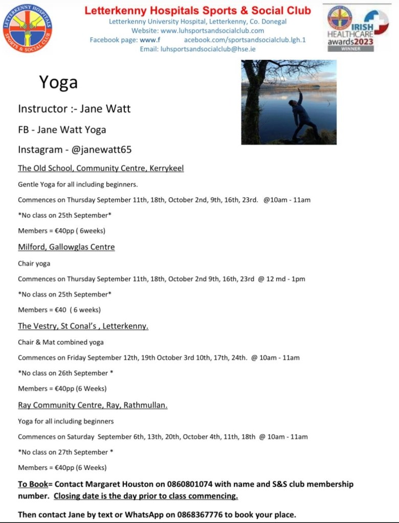We have a selection of Yoga Classes with Jacqueline Toner re-starting for Sept – Oct in various locations as mentioned in the poster below. Please see posters attached for further information & booking details.