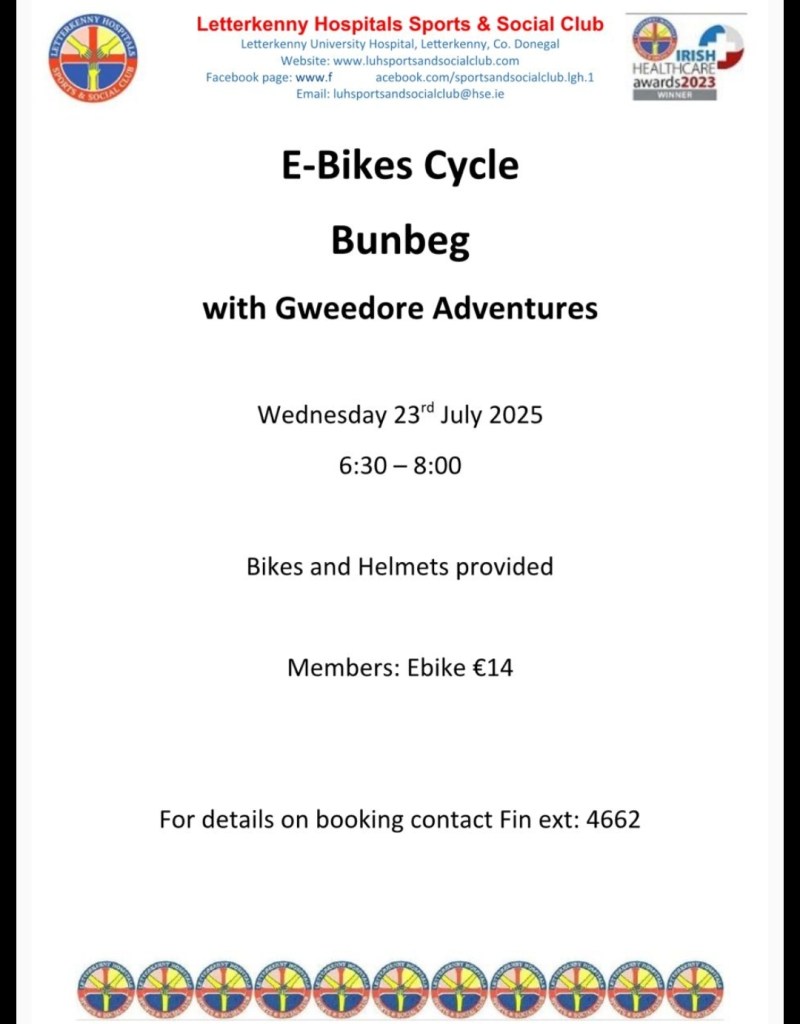 Limited availability on our Kids Summer Camp. Please contact Angela (contact details on poster attached) and book in order to avoid disappointment. Our Letterkenny Hospitals Sports and Social Club Kids Summer Camp will be taking place this year from Wed 13th – Fri 15th August 2025. Please see poster attached for further information & booking details. Registration will take place on Wed 25th June 2025 from 8am – 10am outside the Staff Canteen, LUH. Can i please remind everyone who is interested in taking their children to this years Summer Camp to kindly collect a form and have it filled out for registration. We would also like to remind you that we can only accept Cash payments & it would be really helpful if you could bring the exact amount.